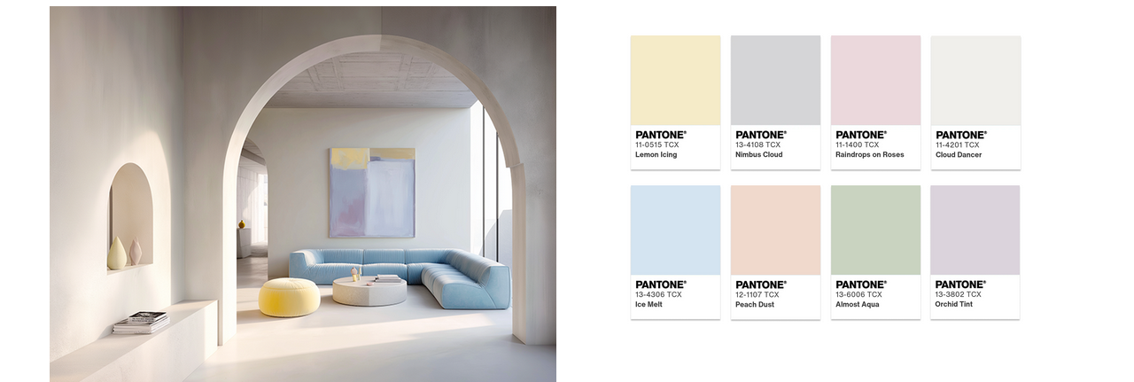 ترکیب رنگهای پاستلی و خنثی، هماهنگی دلنشینی با Cloud Dancer ایجاد میکند؛ تغییراتی لطیف در تُنهای رنگ که ظریف، دلپذیر و متین هستند.